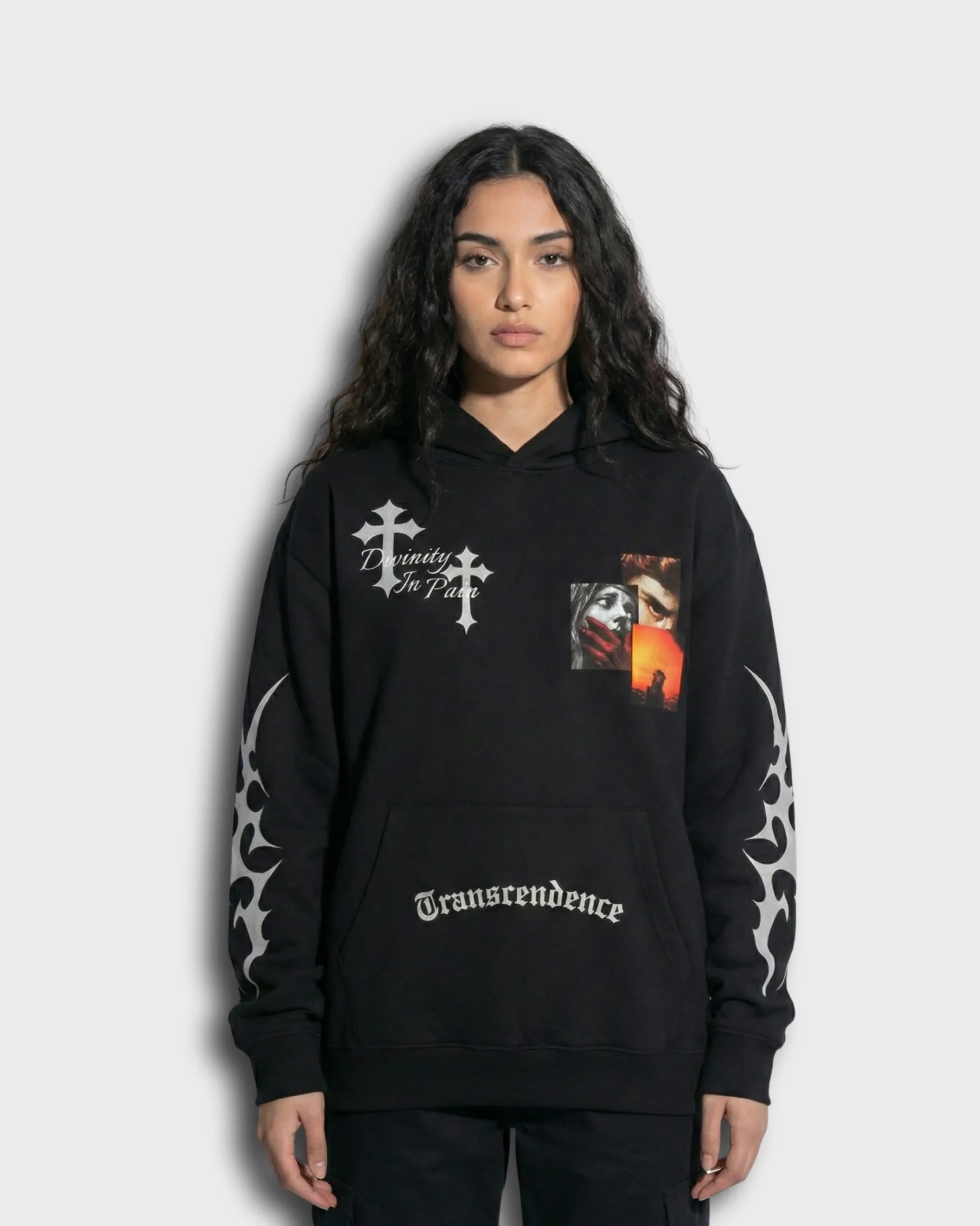 On the lower front, the word “Transcendence” is printed in vintage gothic typography, symbolizing rising above struggle and limitation. The sleeve tribal patterns add a sharp, aggressive streetwear edge, giving the hoodie a complete 360-degree design impact.
