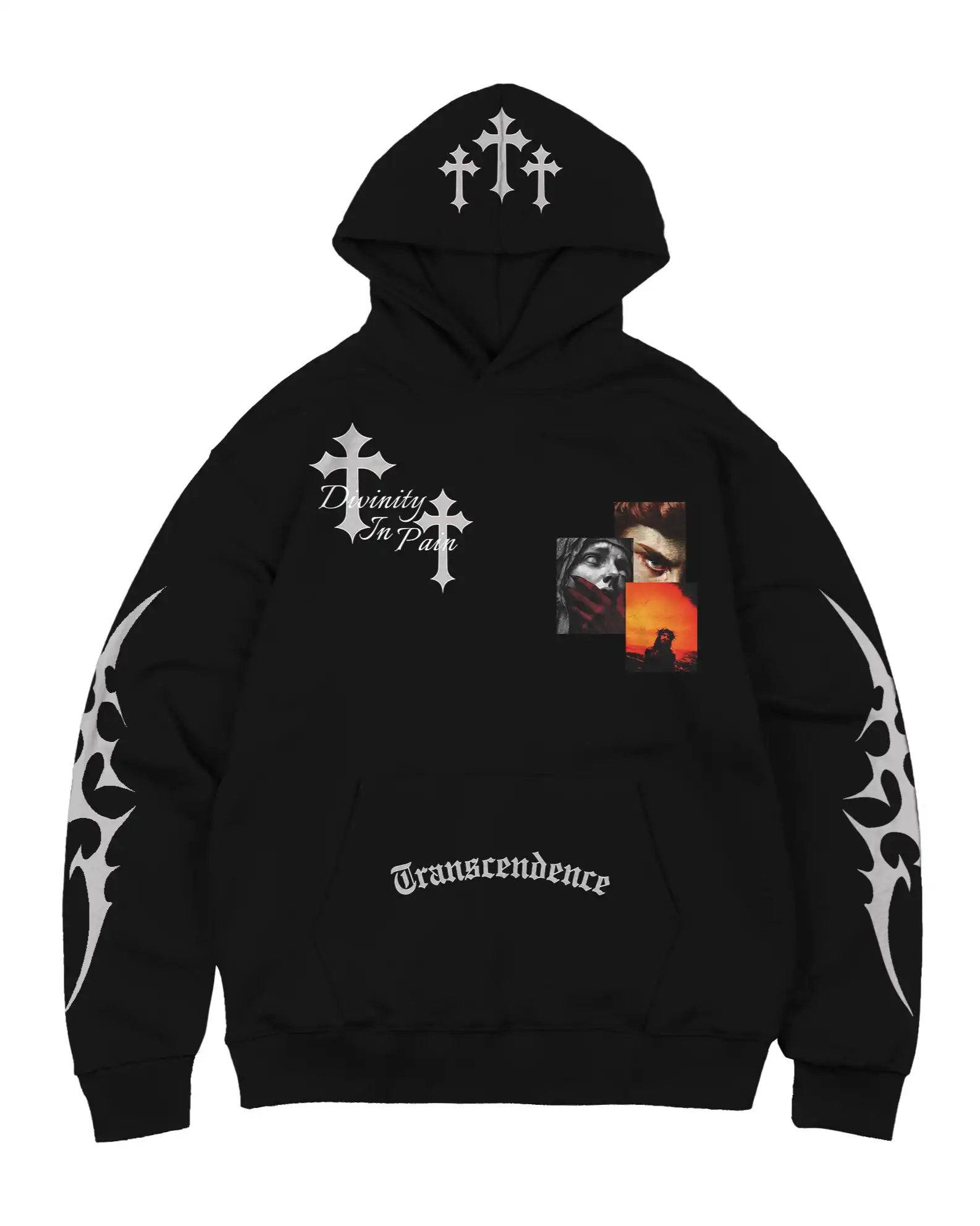 This hoodie features a striking chest graphic with gothic cross symbols and the words “Divinity in Pain”, representing the balance between suffering and spiritual power. The hood is detailed with triple cross symbols, enhancing its sacred yet rebellious identity.